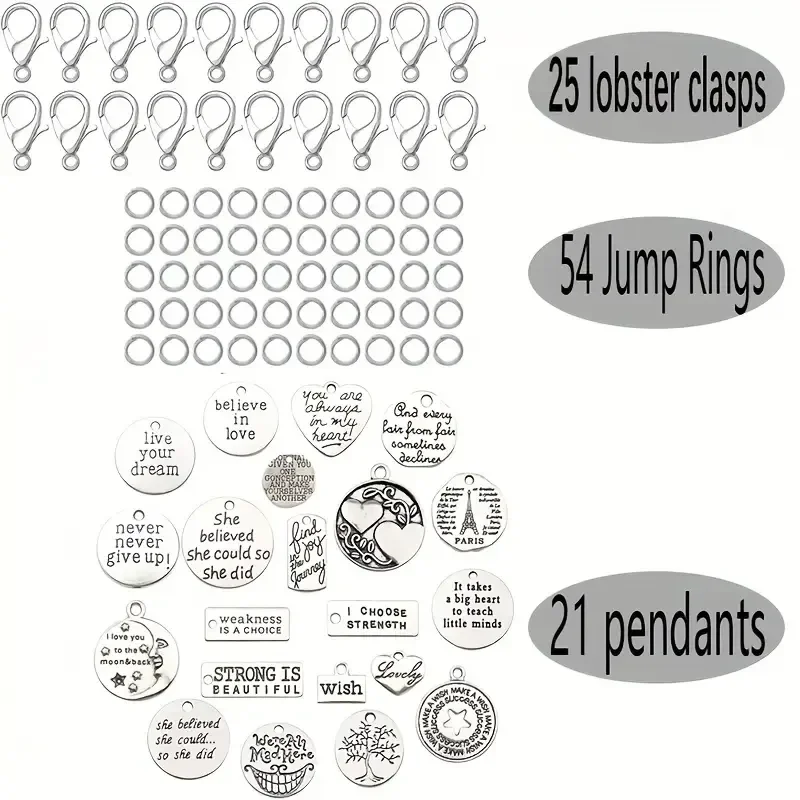 100pcs Antique Silvery Inspired Keychain Making Set, Craft Supplies with Text Pendants, Lobster Clasps, Open Rings for Jewelry Making Accessories. Fun activity for school, mothersday, carnaval, Family activity, Graduation, teachers