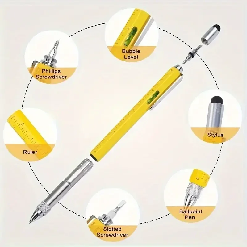 1PC 6-in-1 Heavy-Duty Multitool Pen - Water-Resistant, Retractable, Metal Construction With Medium Point, Ballpoint Pen, Ruler, Stylus, Level, Screwdriver - Perfect Gift for men and women, Stocking Stuffers, And Dad Gifts
