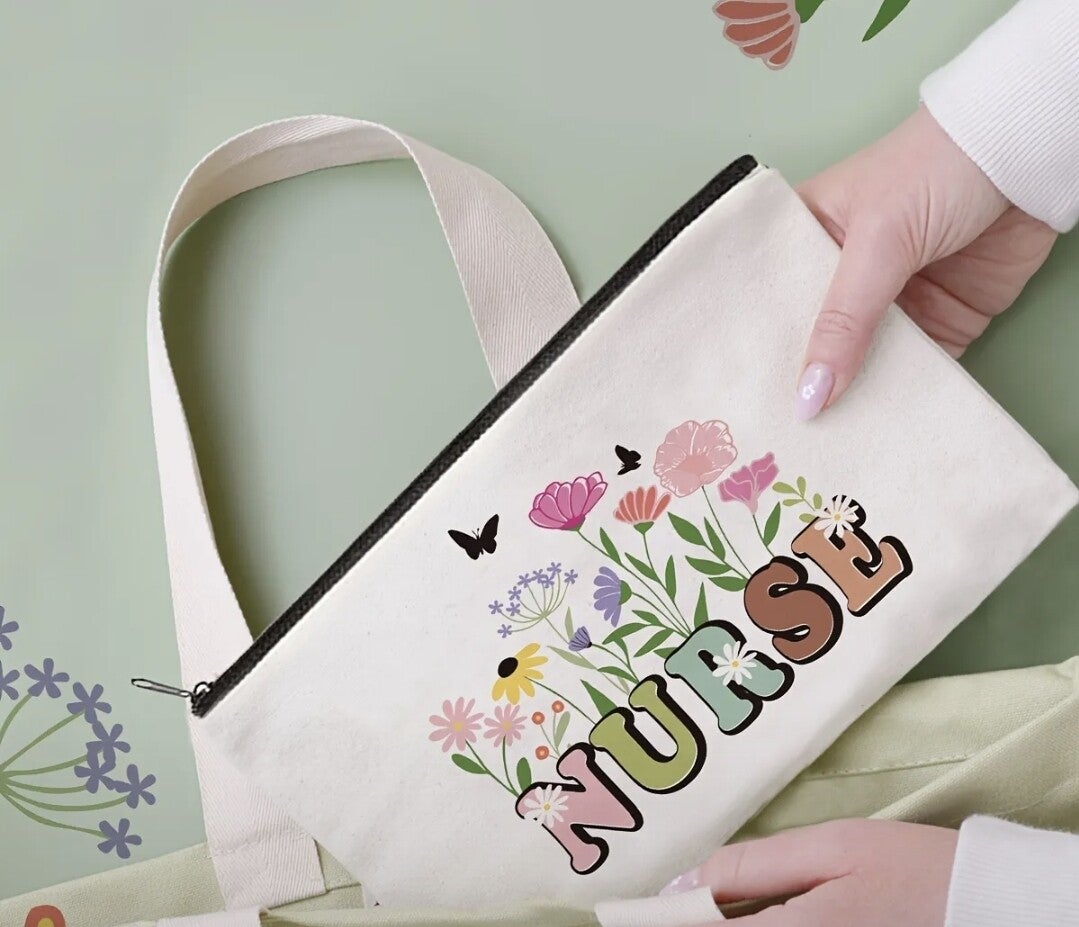 10pcs Nurse Theme Floral Butterfly Small Fresh Printed Pattern Zipper Pouch Makeup Bag, Non-Waterproof, Canvas Material, Alcohol Free, Positioning Printing, with Various Items Storage, for Nurse, Thanksgiving, Christmas, Graduation Gift